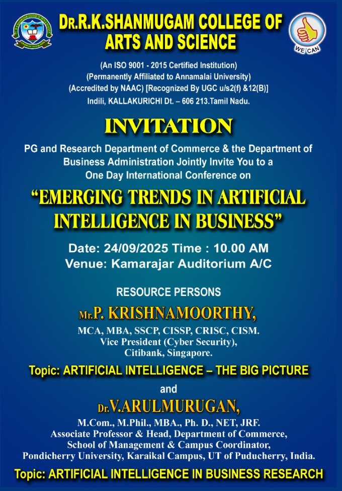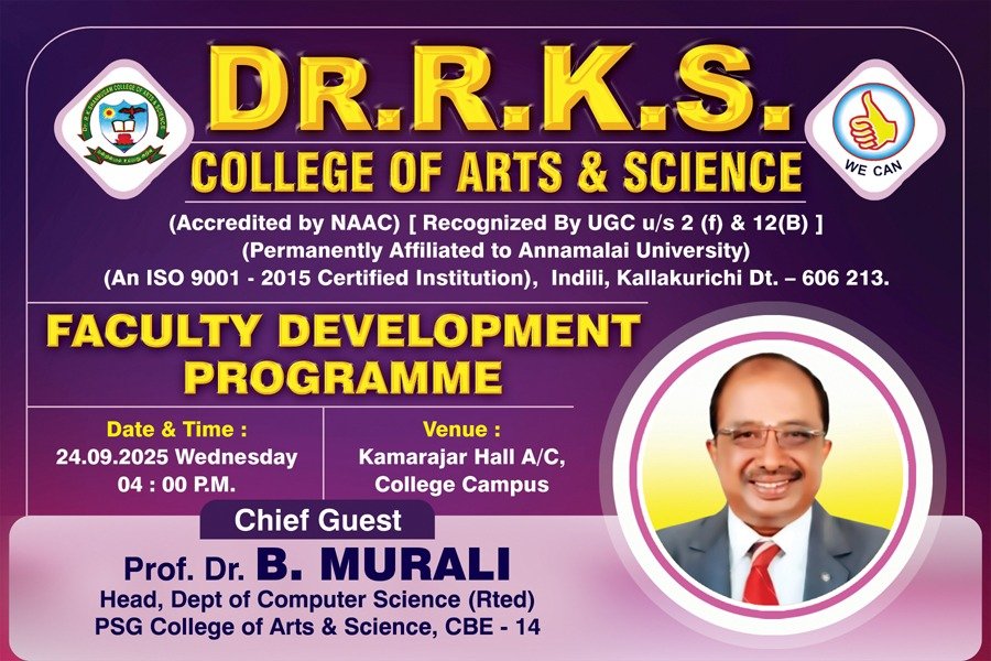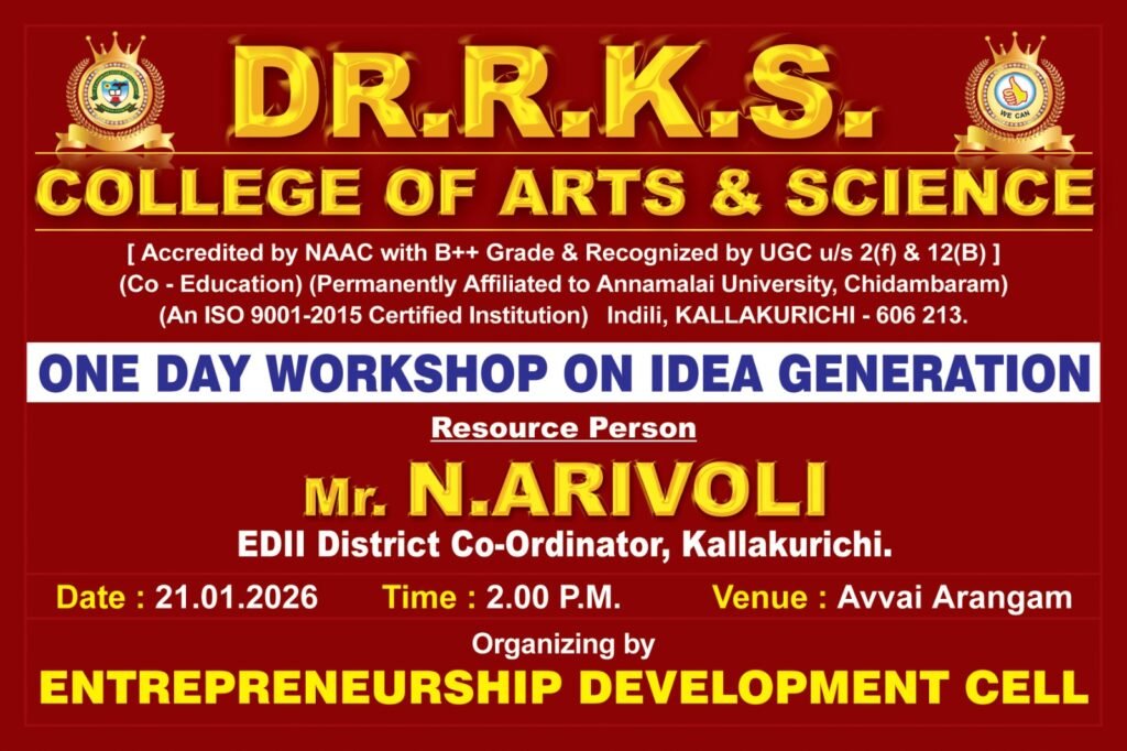 DR.R.K.Shanmugam Educational Trust was founded during the centenary celebration of his birth to prepetuate the memory of the late DR.R.K.Shanmugam the first finance minister of independent India and former Vice chancellor of Annamalai University. The age long dream of the people of Kallakurichi thus came true when DR.R.K.Shanmugam College of Arts and Science was established.